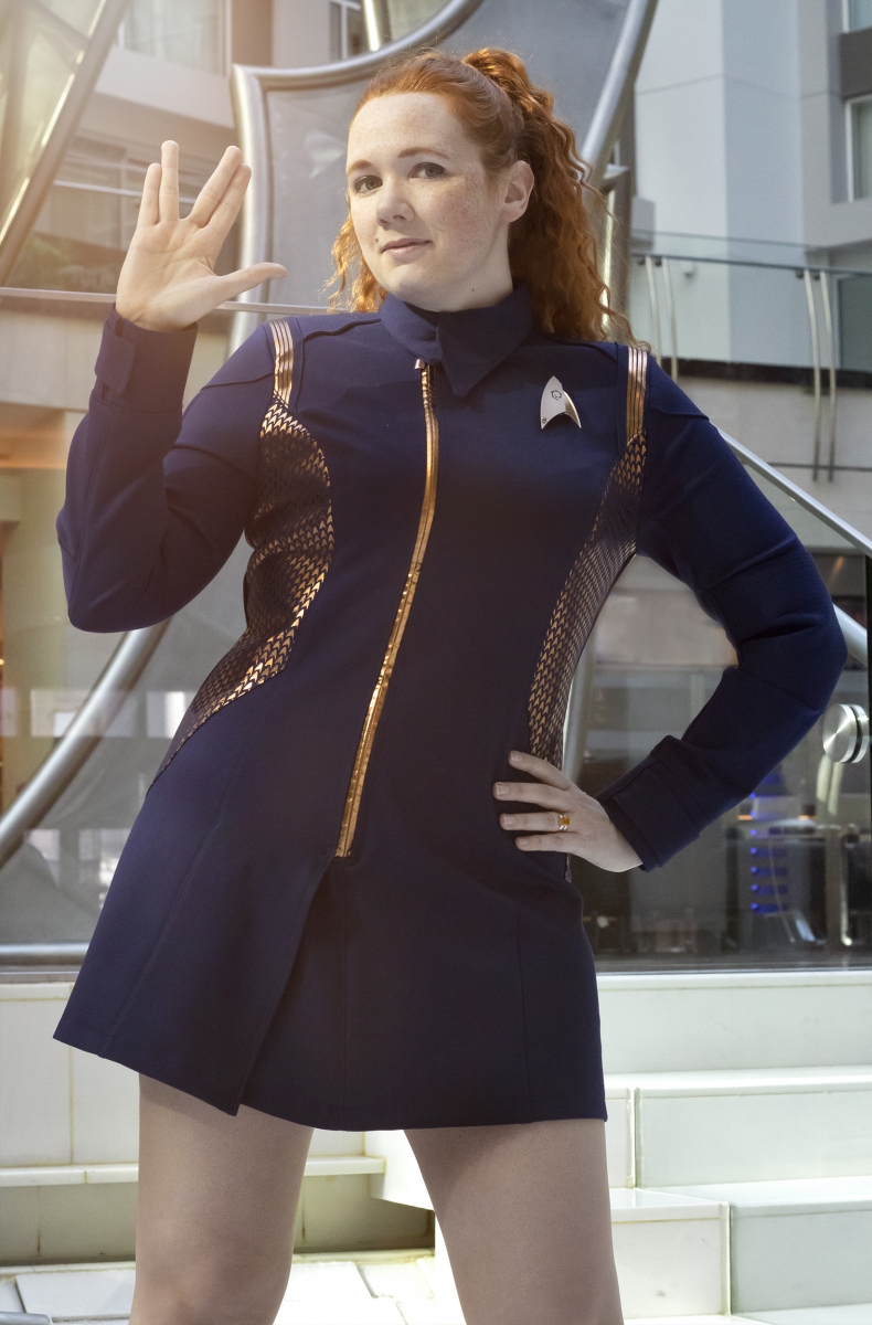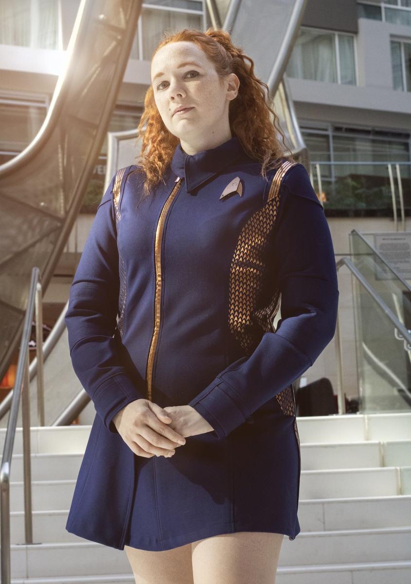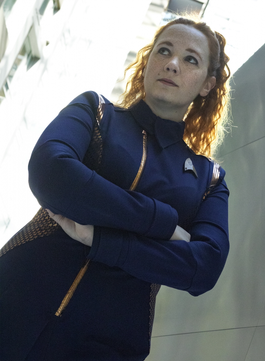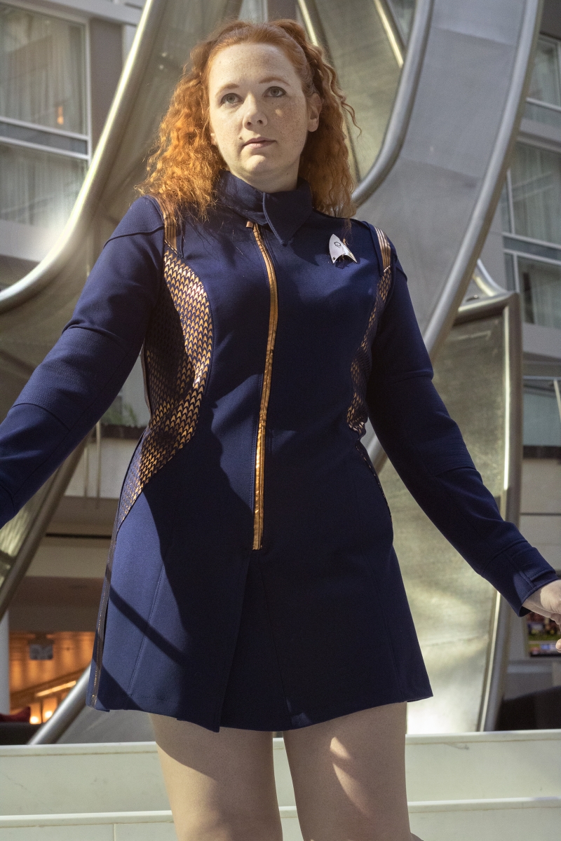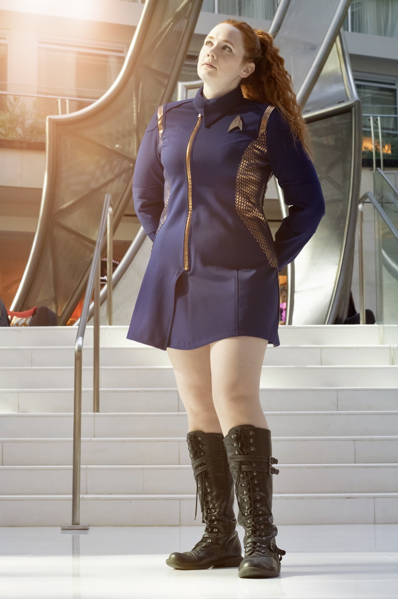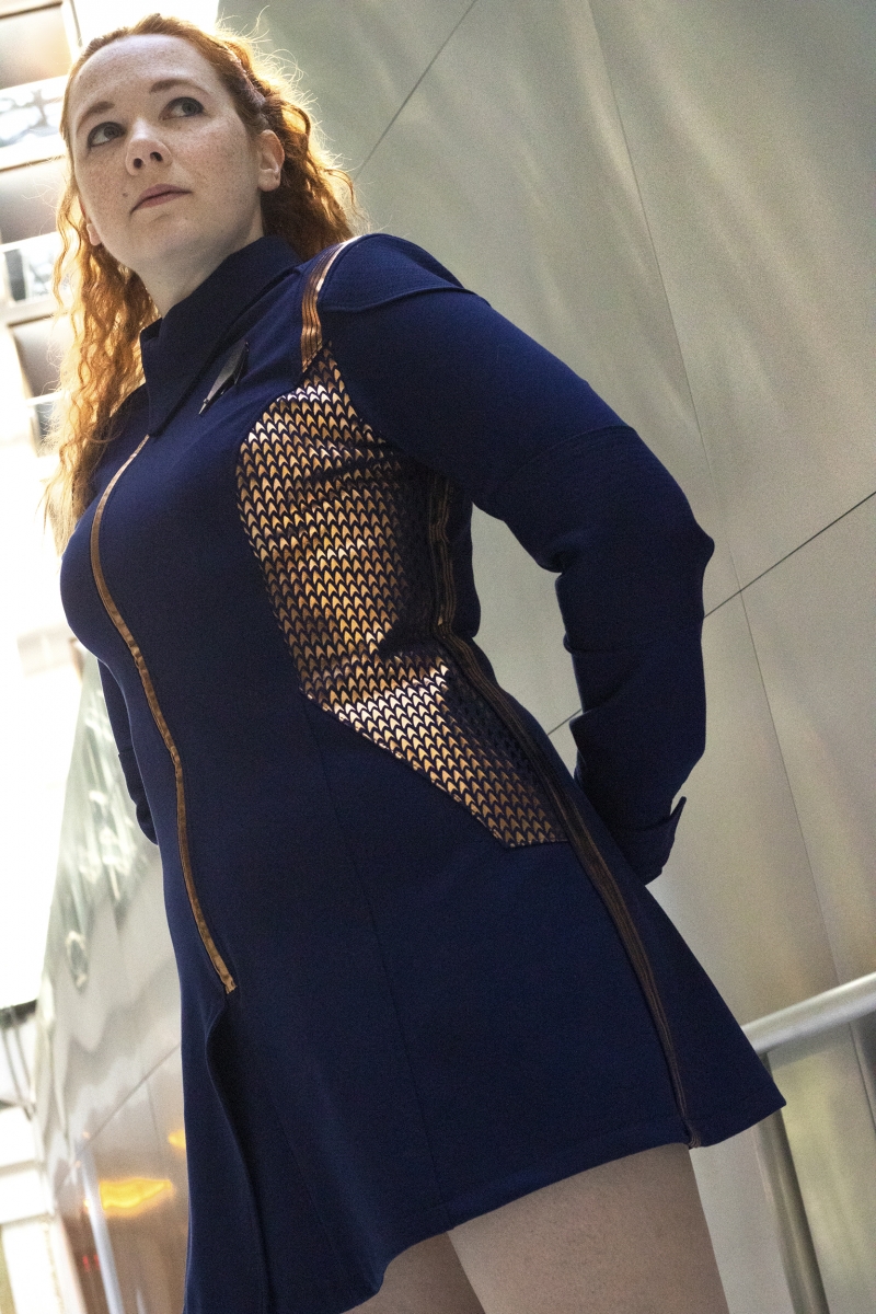 This gallery features her custom Star Trek Discovery skant-style uniform, a project totaling over 60 hours of work. Be sure to head to the next page(s) for her photos detailing the process of making this one of a kind costume, and the stunning Discovery purses and bags which are available for custom order through her Etsy shop, where you can find “fashionably geek handbags and wallets for everyone!”