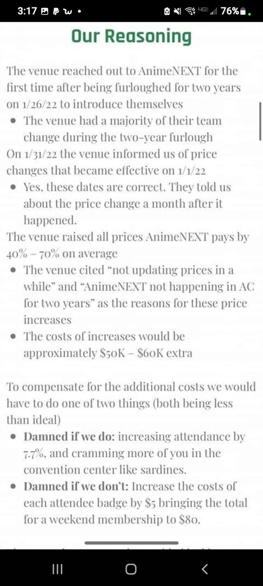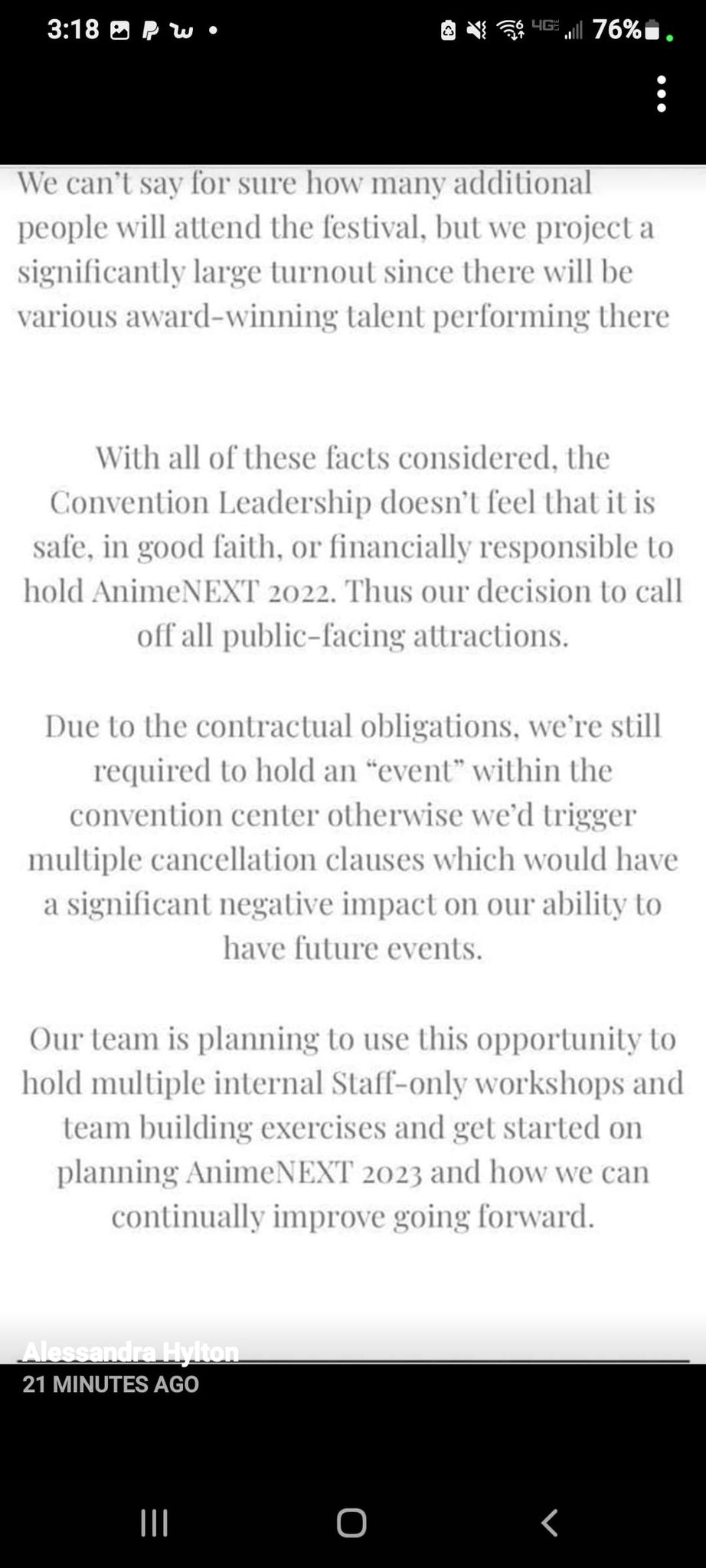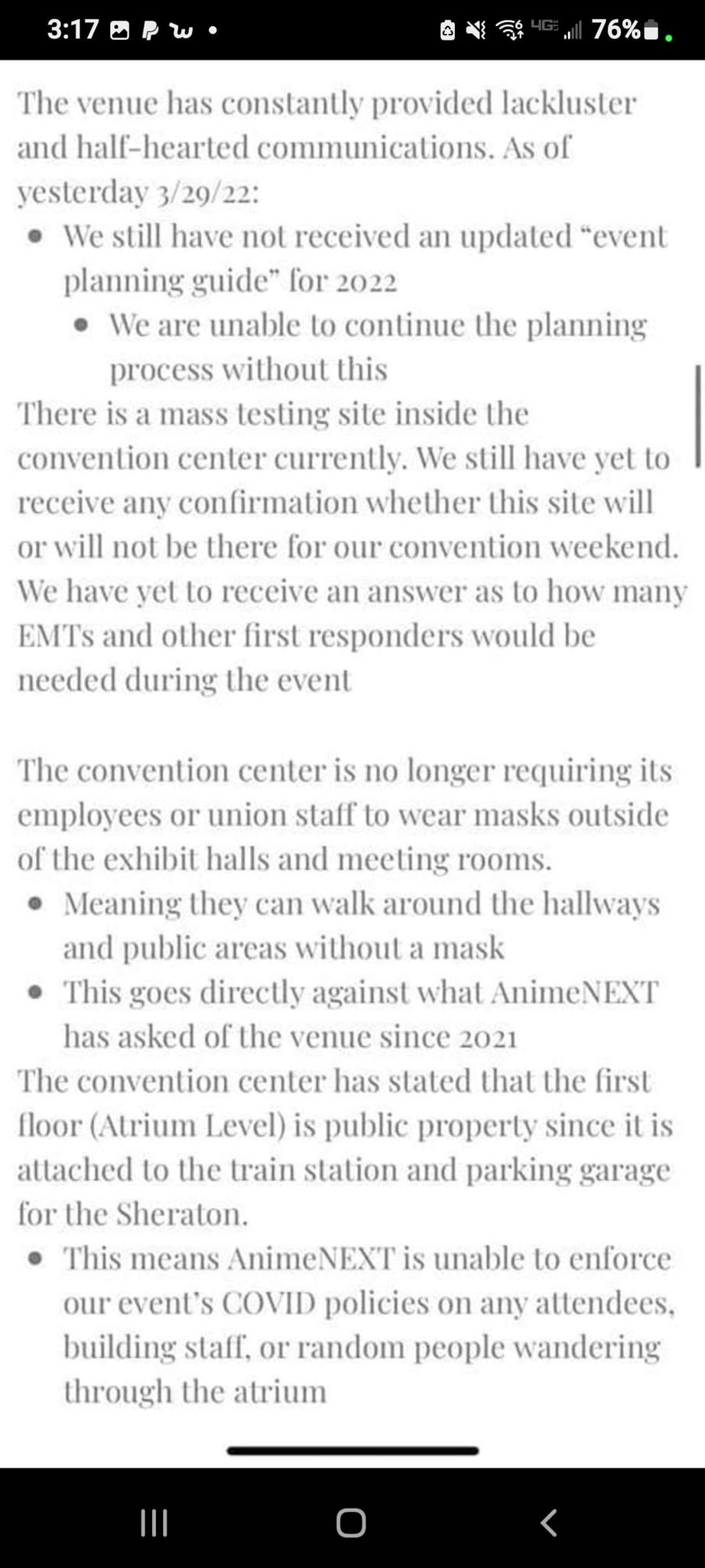 AnimeNext has removed this section from their statement and has updated it to say that “Due to the contractual obligations, we’re still required to hold an “event” within the convention center; otherwise, we’d trigger multiple cancellation clauses which would have a significant negative impact on our ability to have future events.”